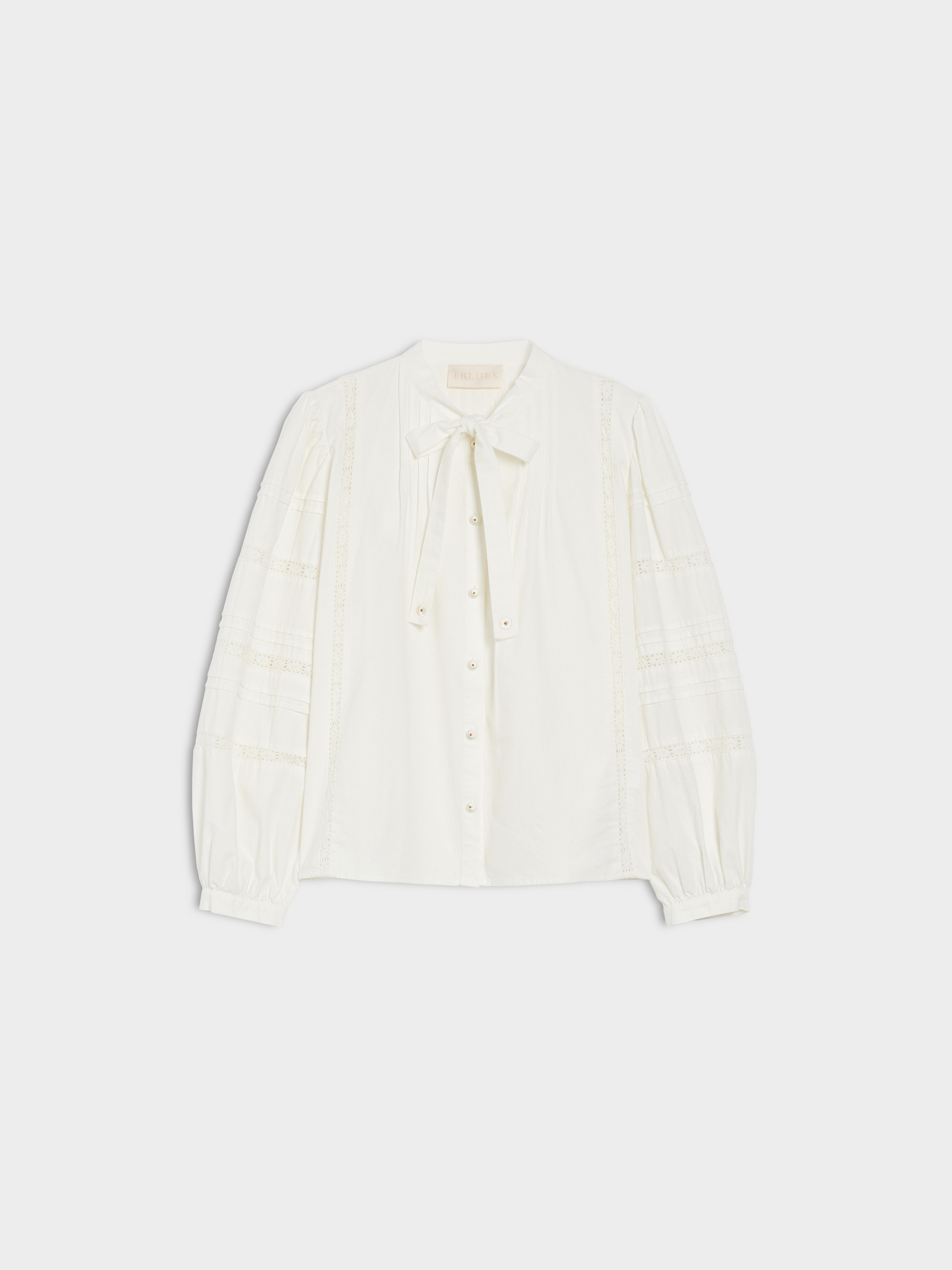 • Tie-up darted band collar and loose-fitting long pleated sleeves with gathered cuffs