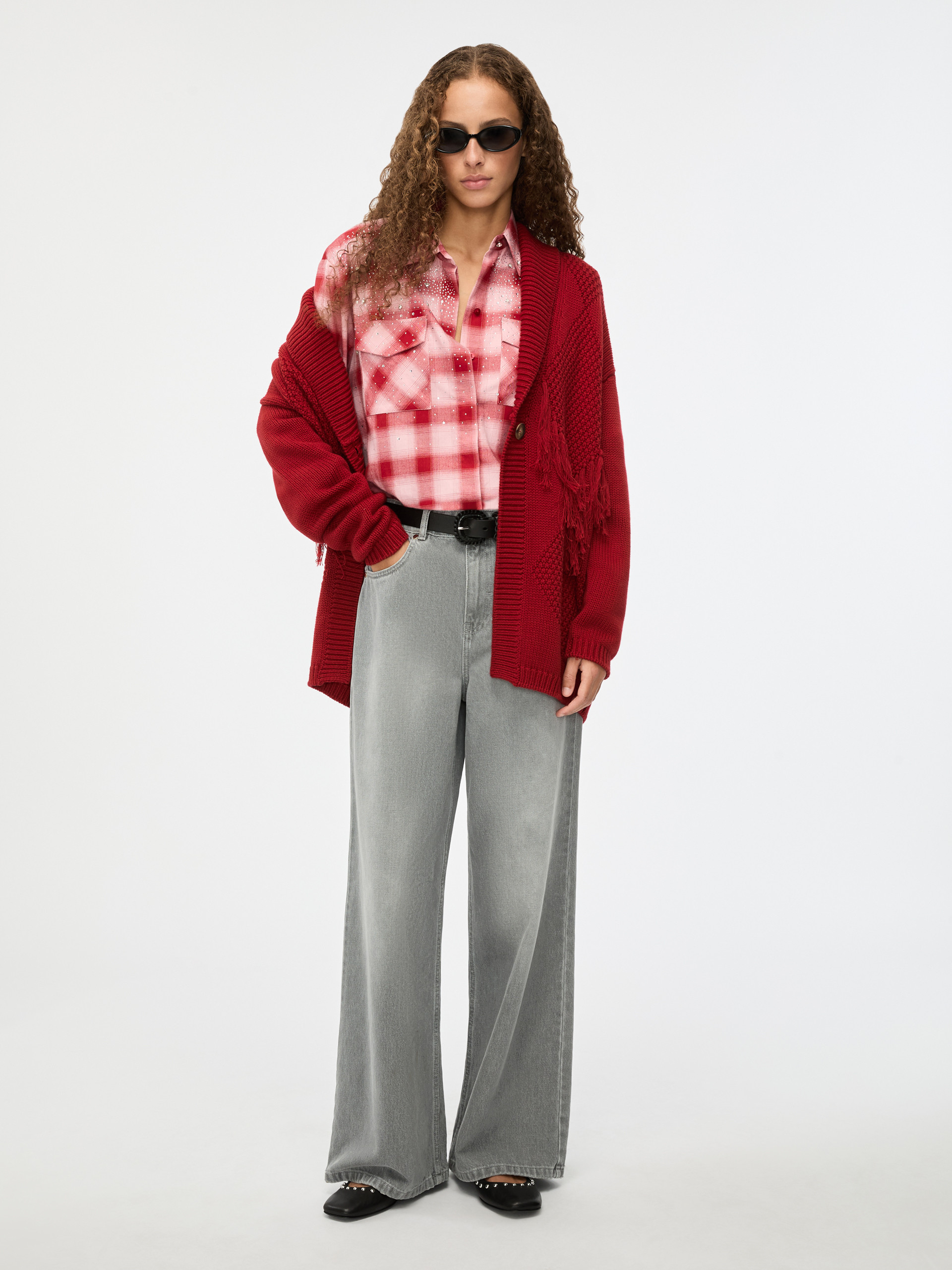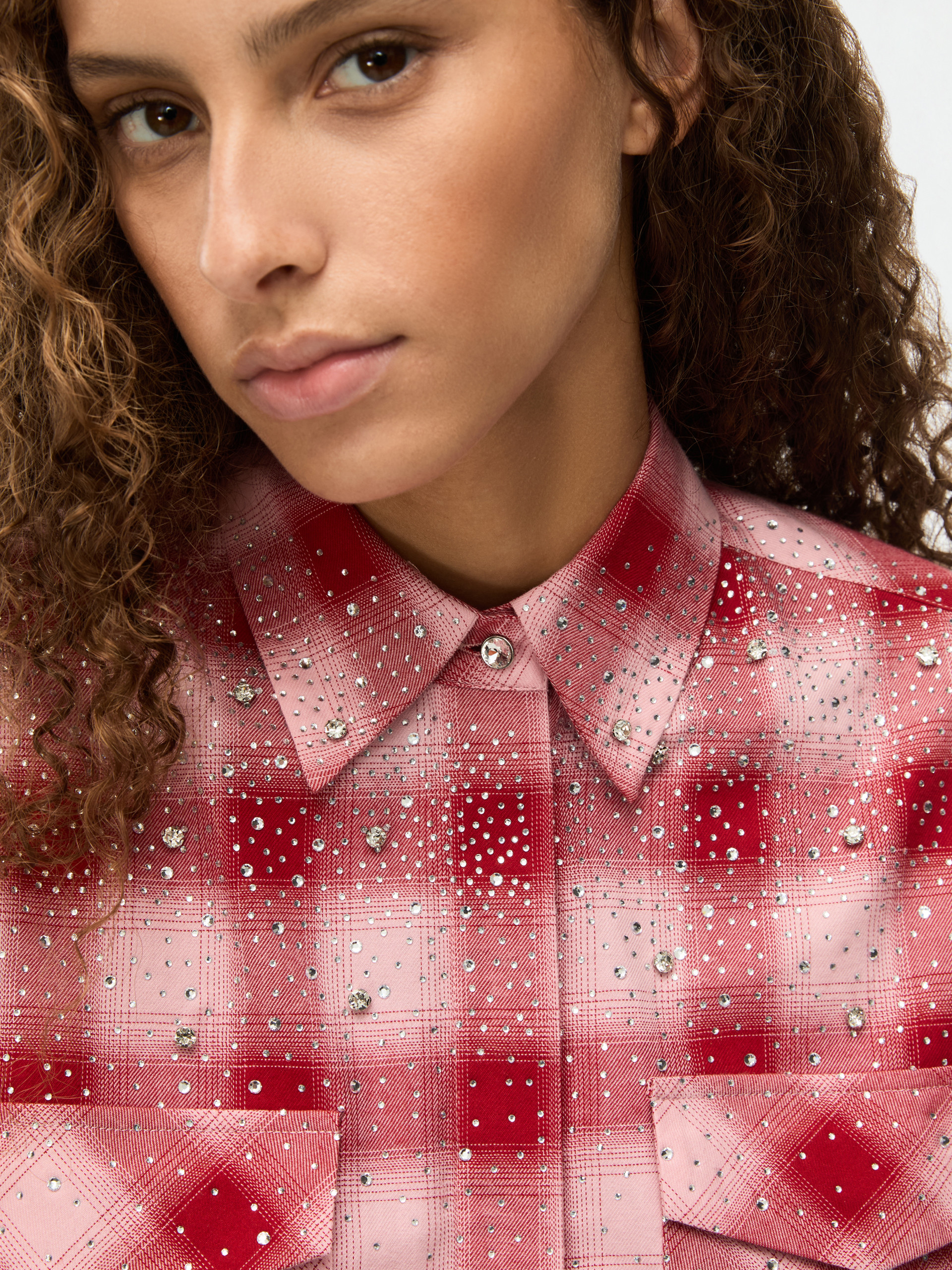 • Collar, and long sleeves with bejewelled buttons on the cuffs